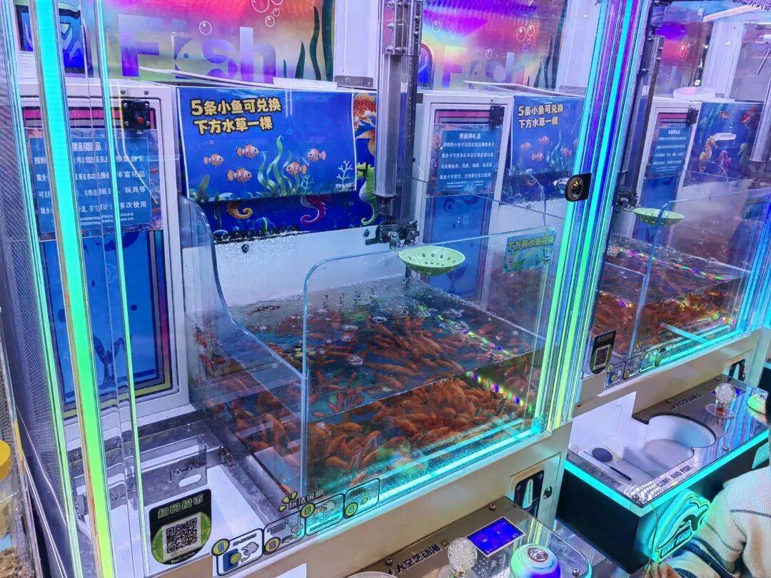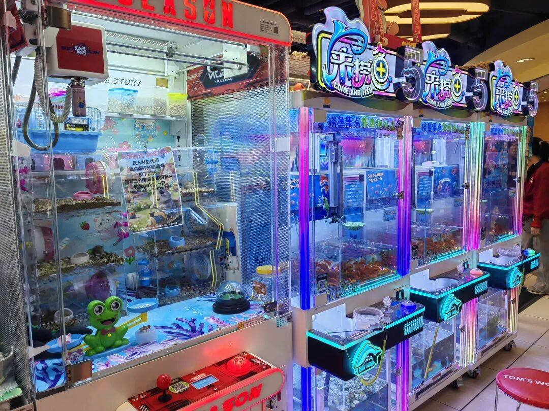 透明箱体内,红色小鱼在水中游动,抓夹变成了漏勺垂悬其上;隔壁的娃娃机里,仓鼠在饲养箱内,兔子则由一圈栅栏围着——这不是宠物店,而是出现在上海多家游艺娱乐场所内的“活物娃娃机”。